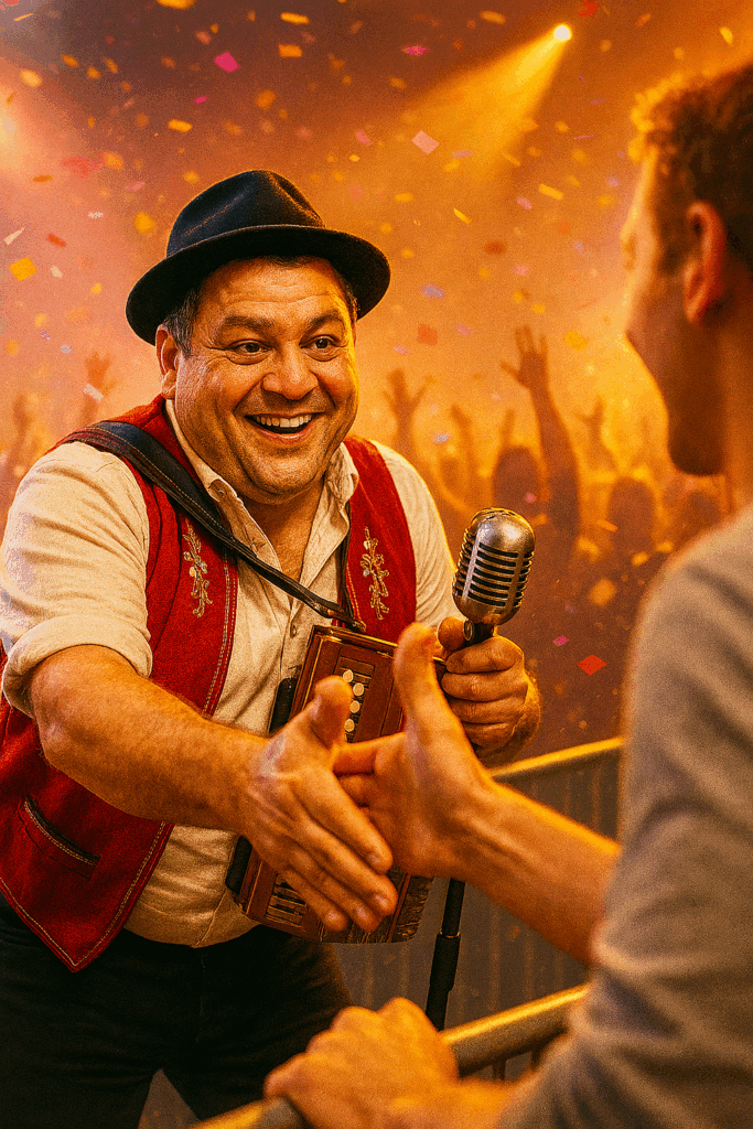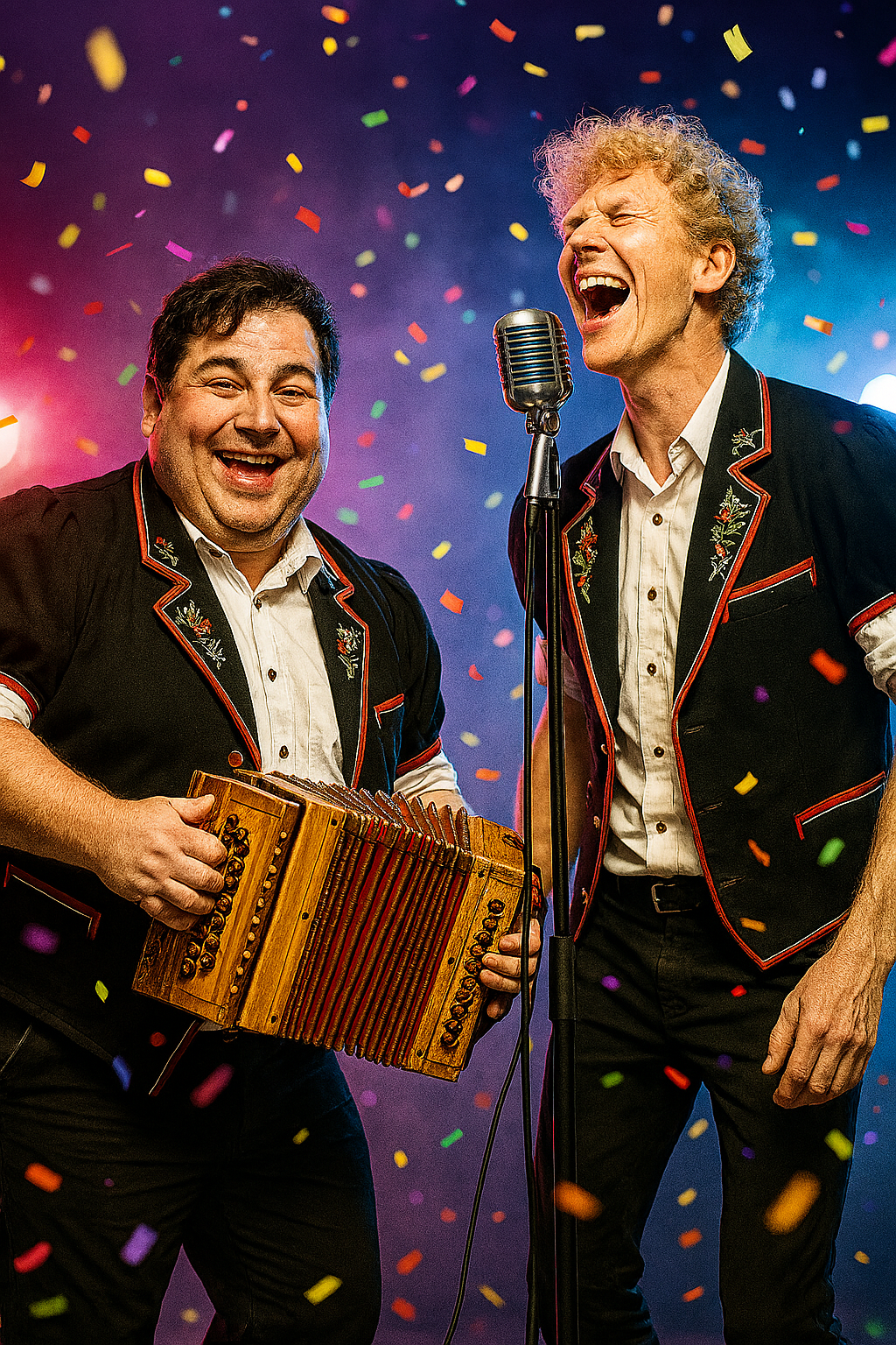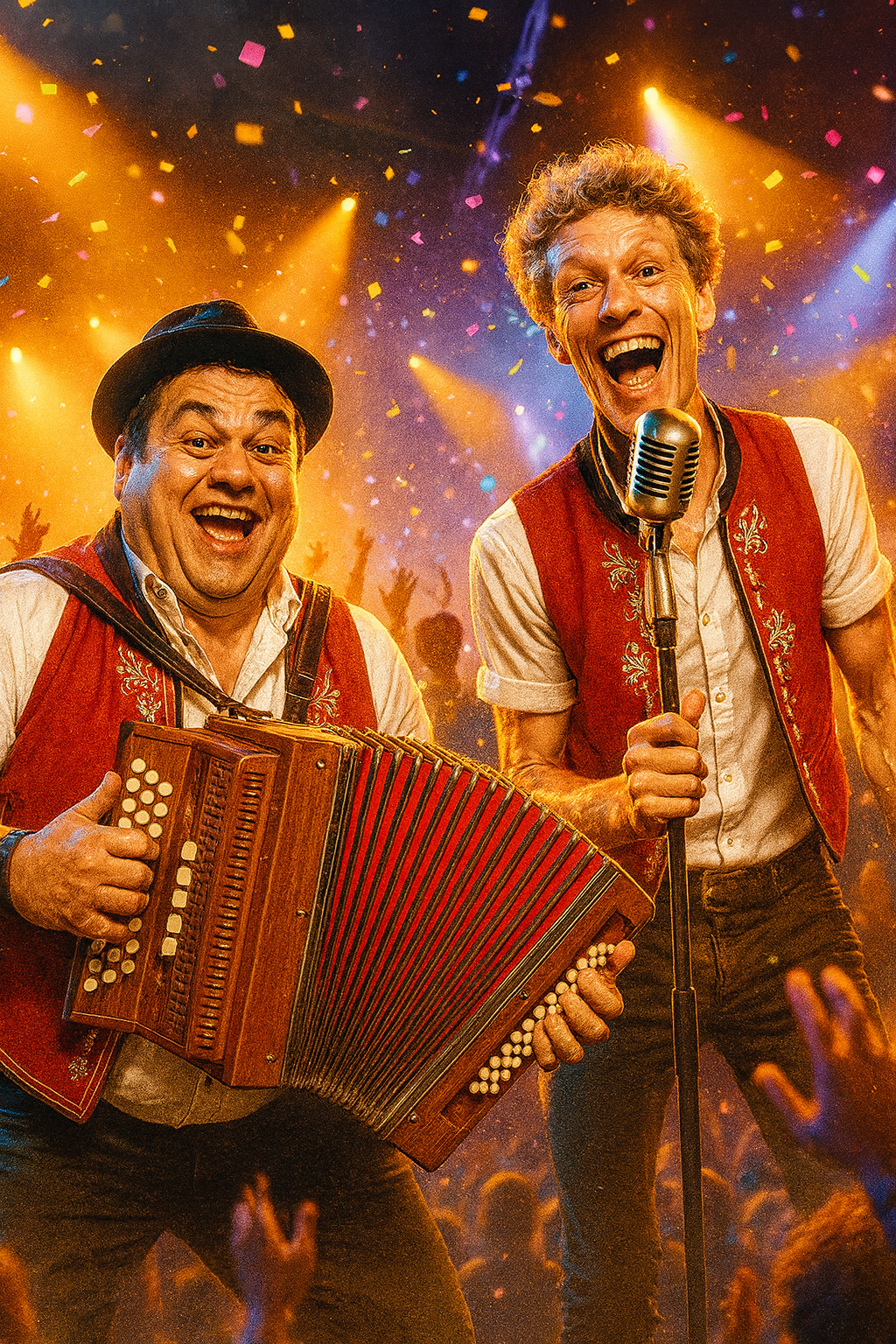 AlpenChlöpfer is a Swiss duo that turns traditional folk music on its head with “Urban Ländler” – accordion grooves, rap cadences, and cheeky lyrics meet modern beats. Frontman LauReal is the tall, blond showman: a singer and rapper with a wild mane of curls, an edelweiss shirt, and a streetwear flair, who transforms tradition into crowd-pleasing hooks. His counterpart, Hard Dy, is the sound tinkerer: an accordion virtuoso, beat producer, and harmonist who combines classical Ländler aesthetics with a hip-hop attitude. Together, they deliver energetic shows full of humour, danceability, and surprise – imagine accordion meeting beatbox, classic outfits remixed with sneakers, and village stories told at night in the city.
